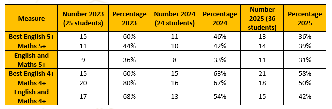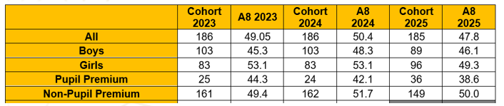 The number of students achieving each measure has increased. However, due to the greater number of students in the Disadvantaged student cohort, the percentages have decreased slightly. The overall attainment score for the Disadvantaged cohort is significantly impacted by 6 students. However, this is a clear focus for the 2025-26 academic year.