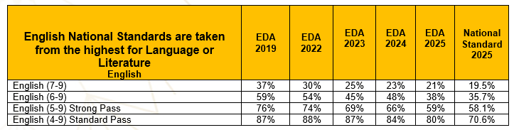 Our best English attainment percentages are in line with or above the National Standard for 2025. However, our English Language results demonstrate a slight decline for the first time since the GCSEs were reformed in 2016. Comparative to the national picture, our English Language results demonstrate that (Grades 7-9 10% v 19.5%, Grades 6-9 28% v 35.7% and Grades 5-9 47% v 58.1%). English Language results at Grades 4-9 are at the National Standard 70% v 70.6%. Competitively, and with the students having the exact same teacher for English Language and English Literature, the English Literature grades were better when comparing our performance with the National Standard (Grades 7-9 17% v 20.3%, Grades 6-9 34% v 38.7%, Grades 5-9 52% v 54.2% and Grades 4-9 77% v 74.2%).