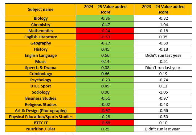 The following subjects have achieved a positive value added for 2024 – 25; History, English Language, Music, Drama, Criminology, BTEC Sport, Sociology and Food and Nutrition. The following subjects improved their value added compared to 2023-24; Biology, Chemistry, Geography, History, Music, Criminology, Psychology, BTEC Sport, Sociology, Business Studies and PE. Subjects where the value added has not improved are Mathematics, English Literature, Photography and BTEC IT.