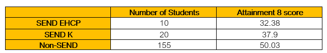 This data outlines the performance of SEND (EHCP and K) students against the non-SEND students.